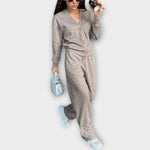 Objavte našu súpravu, dokonalú voľbu pre tých, ktorí hľadajú štýl a praktickosť v jednom. S rovným strihom nohavíc a plášťom s veľkými gombíkmi, tento komplet spája pohodlie ležérneho vzhľadu s upraveným dotykom, ideálny na všetky príležitosti — od práce po výlety.