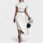 Objavte šaty Florence: odev, ktorý spája eleganciu a modernosť v uvoľnenom A-silhouette. Ich asymetrický dizajn pridáva dynamiku klasickému štýlu, zatiaľ čo strukturný vysoký golier prináša moderný nádych.