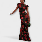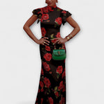 Tieto ohromujúce maxi šaty sú vyrobené z elastického materiálu a majú jedinečný potlač ruží, ktorý pridáva eleganciu pri každej príležitosti. Vďaka klasickému mandarinovému golieru a kontrastnému obloženiu sú tieto šaty navrhnuté tak, aby zanechali dojem.