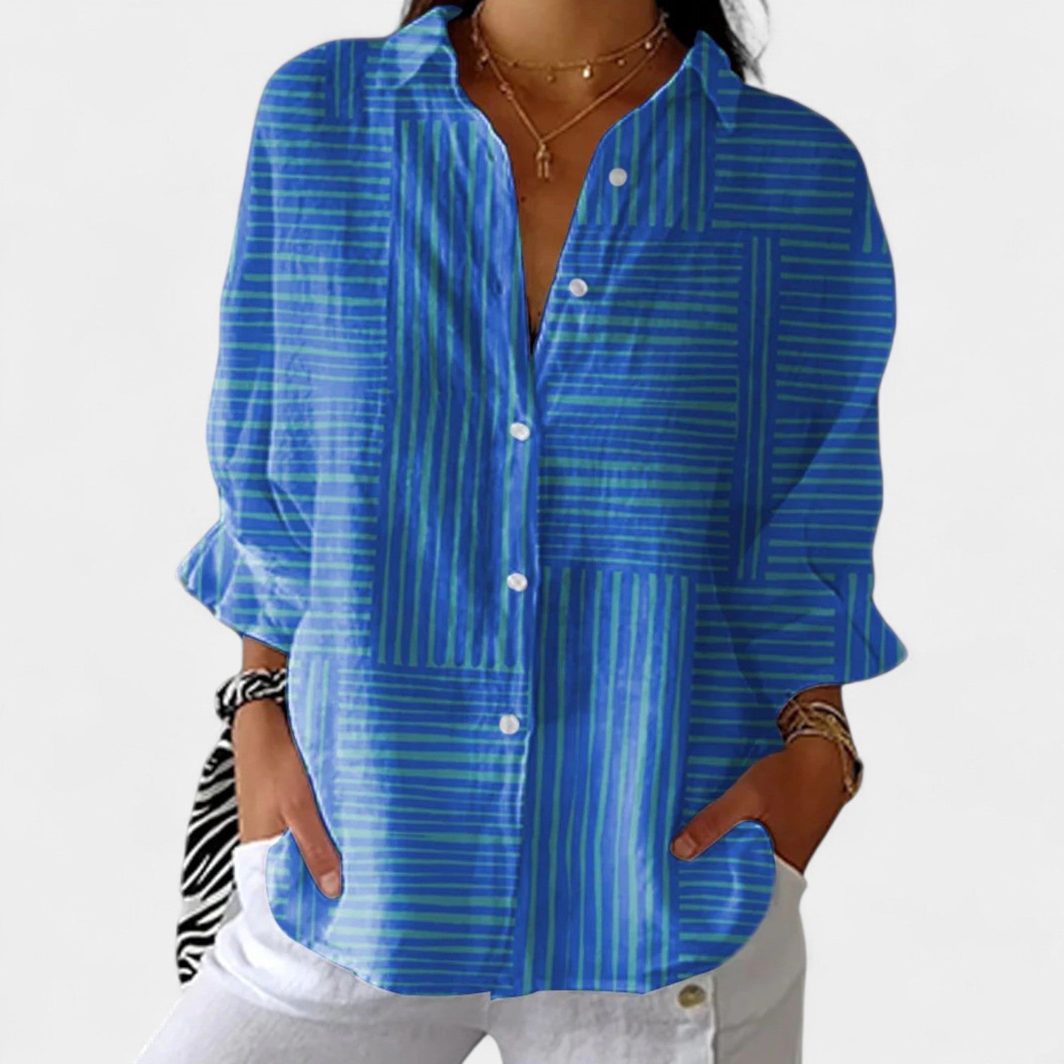 Blúzka Nika spája uvoľnený strih a živý dizajn, ktorý prináša sviežosť do každého outfitu. Jej ľahkosť a priedušnosť zabezpečujú dokonalé pohodlie, či už ju nosíte na prechádzke pri mori alebo pri mestskom káve.