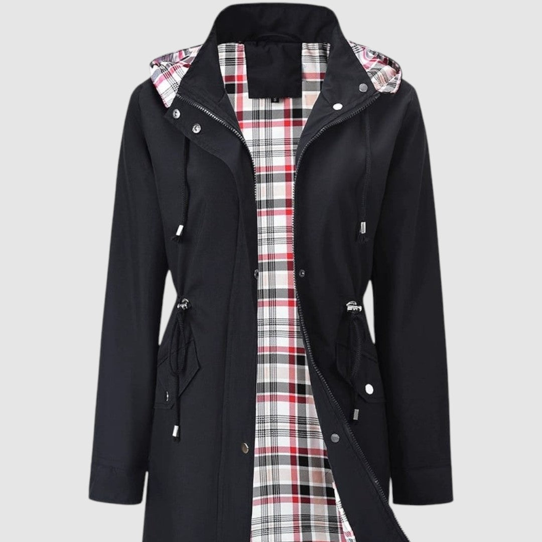 Tento plášť je ideálnou voľbou na daždivé a veterné dni. Vďaka nepremokavému materiálu vás spoľahlivo chráni pred nepríjemným počasím, zatiaľ čo praktická kapucňa a stiahnutý pás pridávajú funkčnosť a ženskosť. Vnútorná podšívka s károvaným vzorom zabezpečuje pohodlie a originálny štýl.