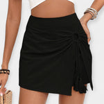 Elegantné a ženské, tieto šortky-sukne s vysokým pásom a diskrétnym viazaním vpredu zvýrazňujú siluetu s dokonalou eleganciou. Ideálne na letné kombinácie, spájajú pohodlie a štýl pri každej príležitosti.