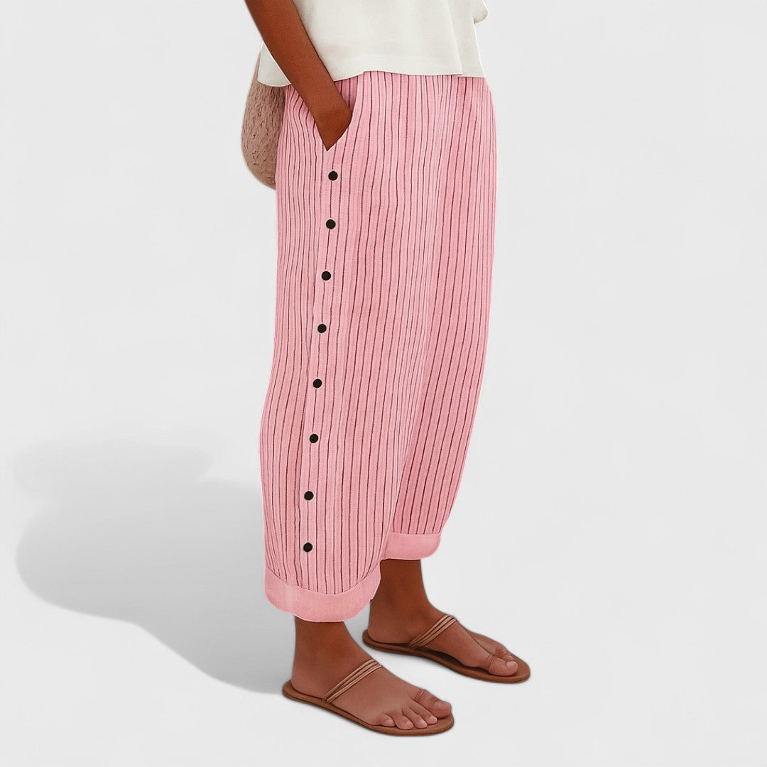 Nohavice Věra sú vyrobené z jemného ľanu, ktorý prirodzene chladí a dýcha. Vďaka voľnému strihu a elastickému pásu poskytujú pohodlie a zároveň vyzerajú upravene – ideálne na prechádzky, večerné stretnutia alebo dni, keď chcete vyzerať štýlovo a zároveň sa cítiť dobre.