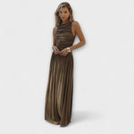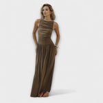 Kruhový výstrih a maxi dĺžka vytvárajú nadčasovú siluetu, ktorá je ideálna na každú príležitosť – od záhradných párty po slnečné prechádzky. Zatváranie na háčik a oko so skrytým zipsom na zadnej strane zabezpečuje bezchybný vzhľad, čo z neho robí elegantnú voľbu pre váš šatník.